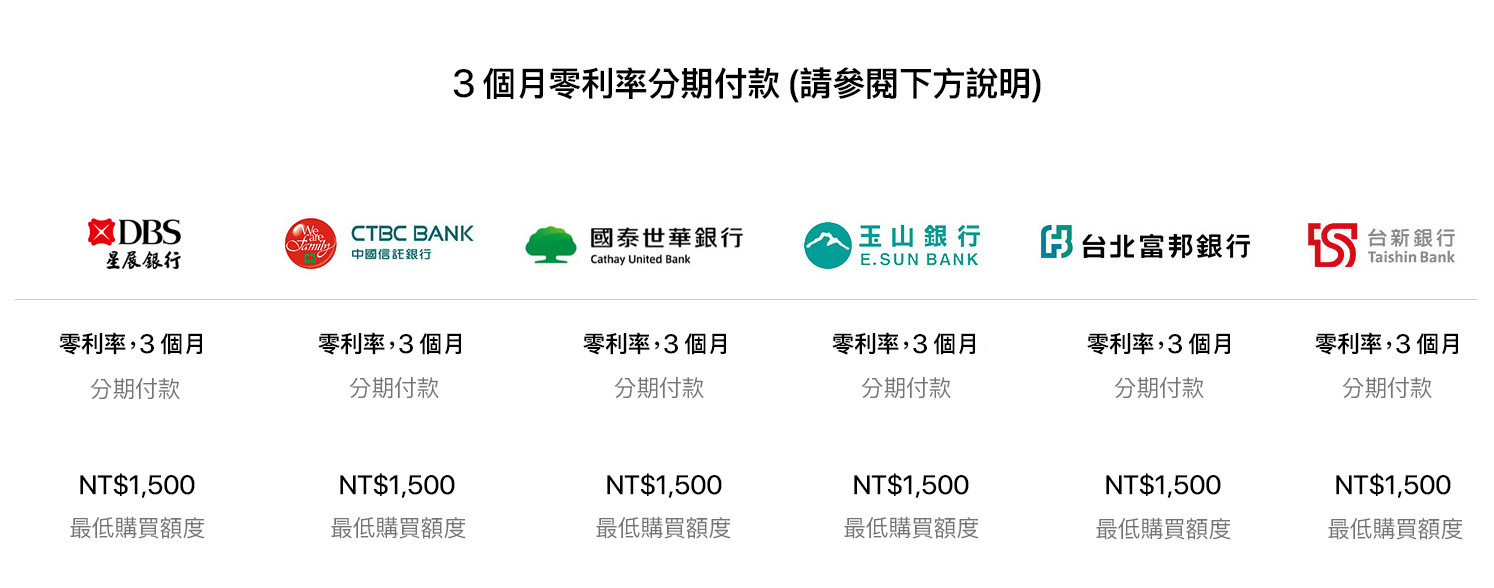 分期付款方案是由信用卡發卡銀行所提供:玉山銀行、台新銀行、星展銀行 (台灣)、國泰世華銀行、台北富邦商業銀行、以及中國信託商業銀行。所有的零利率分期付款購物都須經你的信用卡發卡銀行核准。
